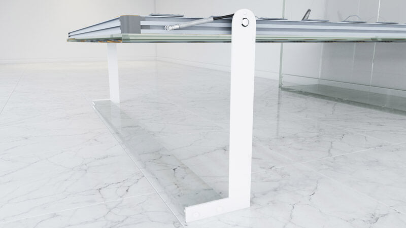 Self-leveling shelf leg mechanism allows to smoothly rotate the shelf when front panel is pulled up or down, and to keep it in horizontal position at all times.